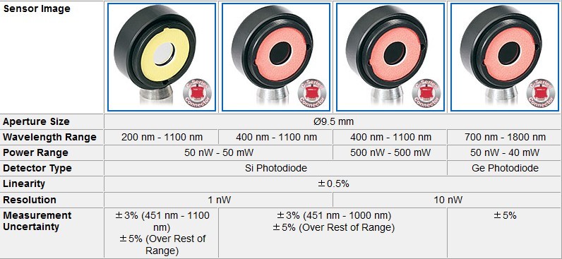 M520 幾乎與所有的功率和能量探頭相兼容(光電探頭,熱敏探頭,熱釋電探頭),應(yīng)用于從紫外到中紅外波段的檢測(cè)。它將光電探頭(超薄型, 積分球型, 光纖型)輸出電流從10 pA到5 mA間劃分了6個(gè)量程,對(duì)熱敏探頭的熱電電壓從100 nV到1 V劃分為4個(gè)量程,兩者都可自動(dòng)或手動(dòng)設(shè)置。表頭對(duì)熱釋電探頭的電壓從100 μV 到100V有4個(gè)手動(dòng)可調(diào)量程,觸發(fā)電平可調(diào)節(jié),范圍從0.1%到99.9%。 用戶可以使用定制的探頭,并上傳一個(gè)響應(yīng)曲線來(lái)進(jìn)行光譜響應(yīng)校正。此外該表頭還配有一個(gè)USB2.0接口可用于遠(yuǎn)程連接控制。以下概述了所有兼容的探頭和適配器。