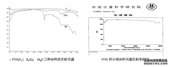 這是一種常用的積分球,用于測量各種樣品的反射率,透射率,在球體上前后兩半球相對位置上開有入光孔,樣品孔,在球體上適當位置裝有接收器,并在接收親器與樣品孔之間設(shè)以擋板,以防樣品的一次反射光進入接收器。這種球的尺寸為 φ30-2500mm ,一般配有支架和底座。內(nèi)表面噴涂優(yōu)質(zhì)的PTFE涂料,反射率高,壽命長,表面整體性好。PTFE涂料的光譜曲線見圖示。