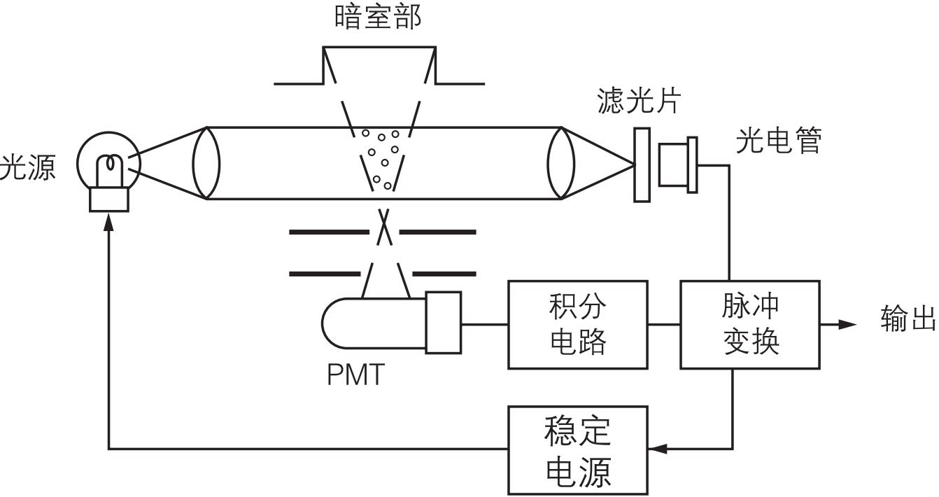 測(cè)試方法使用光散射及β線吸收等,F(xiàn)ig.1 是原理圖。如果光通過(guò)的地方有浮游粒子,光照到浮游粒子上就會(huì)產(chǎn)生散射,浮游粒子越多,散射光越強(qiáng)且和浮游粒子的量成比例。在這種儀器中,用光電倍增管來(lái)接收該散射光,將此信號(hào)積分后變換成脈沖信號(hào),使其輸出和濃度相對(duì)應(yīng)。因?yàn)檫@種方法對(duì)濃度的變化能立刻跟蹤,因此適用于要監(jiān)視連續(xù)且長(zhǎng)時(shí)間變化的場(chǎng)合。