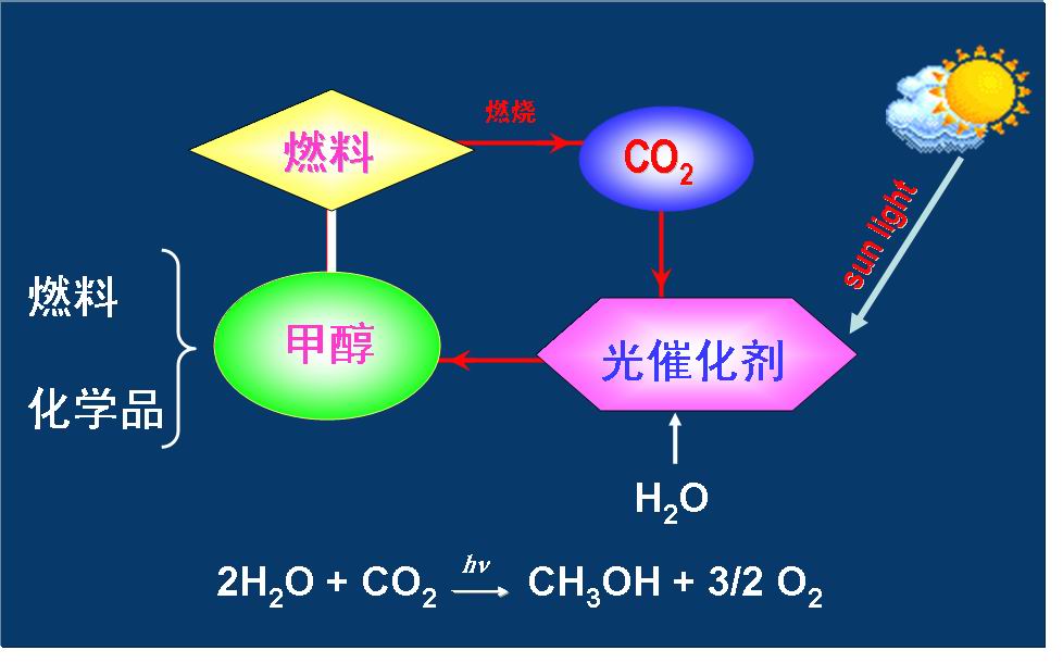 其一是經(jīng)太陽能化學和生物轉化分解水制氫,然后將氫與CO2經(jīng)傳統(tǒng)的光催化轉化為甲醇,和其他的化學品,即:H2O → H2 + 1/2O2,H2 + CO2 → CH3OH,凈反應:H2O + CO2 → CH3OH + O2↑。此過程的關鍵科學問題是:(1)開發(fā)高效光催化劑;(2)將光催化制取的氫從反應體系中有效分離,并與CO2催化轉化耦合。