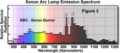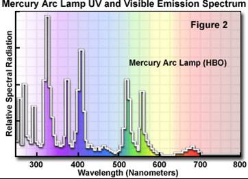 氙燈和汞燈做為白光源,都能提供從紫外到近紅外一系列波長的光,但它們卻有著不同的激發(fā)光譜。汞燈集中在近紫外、藍(lán)光以及綠光附近,這種在峰值的高激發(fā)能量確保產(chǎn)生明亮的熒光信號,但光毒性卻很強。因此,HBO用來對固定樣品或弱熒光成像。相比而言,氙燈光源的激發(fā)比較平緩,可以用于不同波長間強度的比較,例如用于鈣離子濃度測量等。氙燈的強激發(fā)在近紅外800-1000nm。
