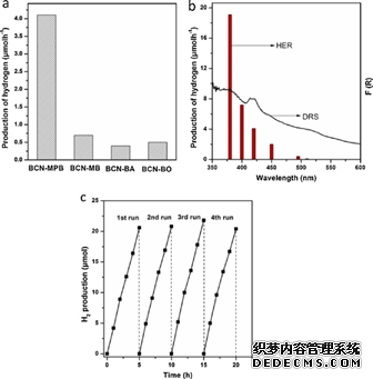 其中,BCN-MPB為納米片,這與其他三種產(chǎn)物不同(BCN-MB、BCN-BA、BCN-BO)。與塊體BCN相比,BCN-MPB具有更大的比表面積、更長(zhǎng)的光生載流子壽命和更強(qiáng)的電子輸運(yùn)能力。因此,其在可見(jiàn)光輻射下具有增強(qiáng)的光催化產(chǎn)氫性能。