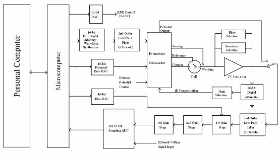 600E為通用電化學測量系統(tǒng)。下圖為儀器的硬件結(jié)構示意圖。儀器內(nèi)含快速數(shù)字信號發(fā)生器,用于高頻交流阻抗測量的直接數(shù)字信號合成器,雙通道高速數(shù)據(jù)采集系統(tǒng),電位電流信號濾波器,多級信號增益,iR降補償電路,以及恒電位儀/恒電流儀(660E)。電位范圍為10V,電流范圍為250mA。電流測量下限低于10pA?芍苯佑糜诔㈦娚系姆(wěn)態(tài)電流測量。如果與 200B微電流放大器及屏蔽箱連接,可測量1pA或更低的電流。如果與