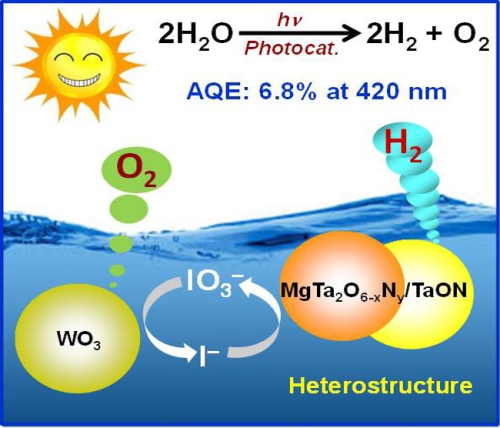 近日,中國科學(xué)院大連化學(xué)物理研究所催化基礎(chǔ)國家重點(diǎn)實(shí)驗(yàn)室及潔凈能源國家實(shí)驗(yàn)室太陽能研究部研究員、中科院院士李燦和研究員章福祥、陳閃山等與日本東京大學(xué)教授Kazunari Domen課題組合作,在可見光驅(qū)動(dòng)光催化Z機(jī)制完全分解水制氫研究中取得進(jìn)展。研究結(jié)果發(fā)現(xiàn),經(jīng)一步氮化合成的MgTa2O6xNy/TaON異質(zhì)結(jié)材料(長可吸收波長達(dá)570 nm)可有效促進(jìn)光生電荷分離,基于此異質(zhì)結(jié)材料構(gòu)筑的寬光譜響應(yīng)Z機(jī)制完全分解水制氫體系,其表觀量子效率達(dá)到目前文獻(xiàn)報(bào)道高值(AQE: 6.8%@420 nm)。相關(guān)結(jié)果在線發(fā)表在《德國應(yīng)用化學(xué)》期刊上。